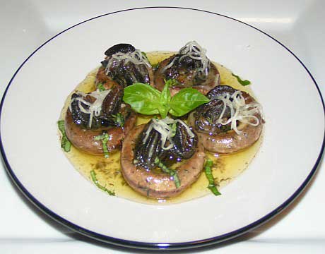 Melt the butter in a small pan and saute the shallots, garlic, celery until softenend and starting to carmelize. Stir in the parsley and salt and pepper to taste. Place a snail in each mushroom cap, and then brush the exterior of the mushroom with a bit of the herb butter. Arrange the mushrooms in individual shallow baking dishes and divide the herb butter between them, spooning a bit directly onto each escargot. Combine the cheeses and divide evenly between the two dishes and cover and refrigerate until serving time. Bake at 375 for 15 - 20 minutes and serve hot with garlic toasts.