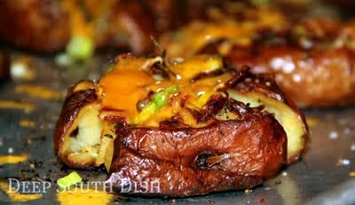 Variation: Can also pan fry potatoes for the second step. Heat oil in a 12-inch heavy skillet over medium-high heat until it shimmers. Transfer potatoes with a spatula to skillet, then lower heat to medium-low and cook, turning once, until golden brown, about 20 minutes total. Fried potatoes can be kept warm in a sheet pan in a 200 degree F oven up to 30 minutes. Sprinkle with green onion, cooked and crumbled bacon and cheese, if desired, before serving.