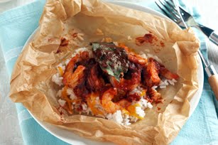 MEZCLA el arroz y el queso; pon cucharadas de esta mezcla al centro de 8 hojas (15x12 pulgs.) de papel para hornear. Ponles encima los camarones, las hojas de aguacate y la salsa de tomate. Dobla las esquinas de cada hoja de papel para formar paquetitos y encerrar el relleno; átalos con un cordel.