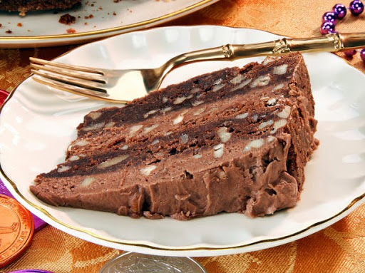 Frosting: Sift the powdered sugar and COCOA over the butter in a medium bowl. Add the VANILLA, then beat until smooth, drizzling the milk in as you go. The icing may not need the final TB. of milk to be smooth. Fold in the pecans. Spread between the cake layers and on top. No need to frost the sides. Refrigerate the cake overnight.