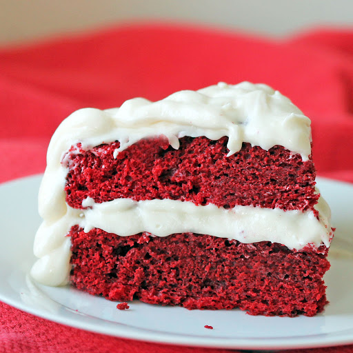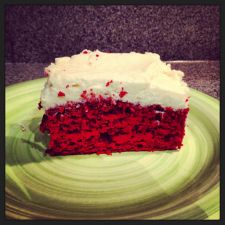 Mix all together and then add red food coloring last. Mix well. Pour into two well greased and floured round cake pans or a 9 x 13 pan. Bake at 350 degrees for 25 to 30 minutes.