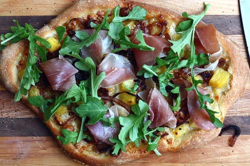 Remove from oven and add the prosciutto, warm caramelized onions and arugula. Yum-town, population: YOU!!