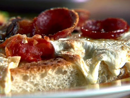 Slice bread horizontally to create 2 pizzas. Lightly oil a baking sheet and place pizzas crust side up. Brush top with 1/4 cup oil. In a bowl, squeeze tomatoes to break up slightly. Place on pizza halves. Pull pieces of Buffalo mozzarella from the ball and place on halves. Top with porcini mushrooms, shredded mozzarella, garlic and pepperoni. Bake until cheese has melted and crust is crispy, about 25 minutes. Remove from oven, drizzle with oil, sprinkle on Parmesan and spread with cut basil. Sprinkle with salt and pepper and serve.