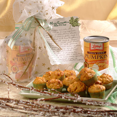 Pour muffin mix into large bowl. Cut in 1/2 cup vegetable shortening with pastry blender until mixture is fine. Add 1 cup LIBBY'S 100% PURE PUMPKIN, 1 cup milk and 2 large eggs; mix until just moistened. Spoon into greased or paper-lined mini-muffin pans, filling 2/3 full. Bake in preheated 400ºF oven for 15 minutes; remove to wire racks. Sprinkle with powdered sugar, if desired. Makes about 60 mini muffins.