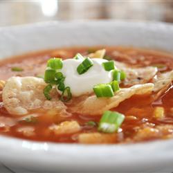 Break up some tortilla chips into individual bowls and pour soup over chips. Top with the Monterey Jack cheese and a little sour cream.
