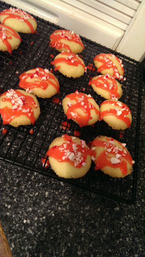 For glaze; in small bowl, combine sugar, butter and extract. Gradually add enough milk for desired consistency. Stir in food coloring. Drizzle over cookies. Immediately sprinkle with crushed candy.