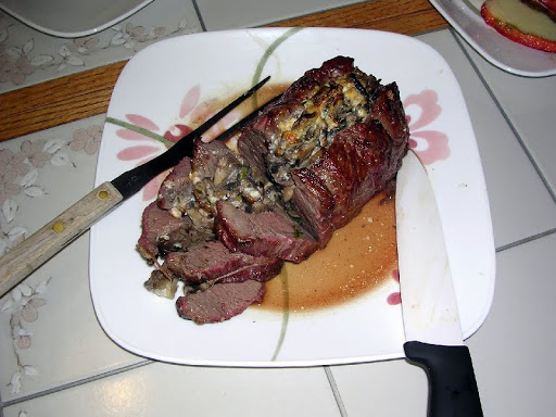 Snuggled between tenders slices of beef tenderloin lie fresh mushrooms, green onions, garlic, and parsley. The stuffing mixture is then topped with crumbles of blue cheese which melts.
