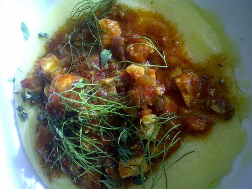 Bring water to a boil with a generous pinch of salt. Whisk in polenta in a thin stream and continue whisking until cooked but still slightly loose. Pour polenta into serving plates, top with baccala, and garnish with fennel fronds.