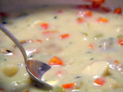 Add the milk and clams and heat gently for a few minutes to cook the clams. Taste for salt and pepper. Serve hot.