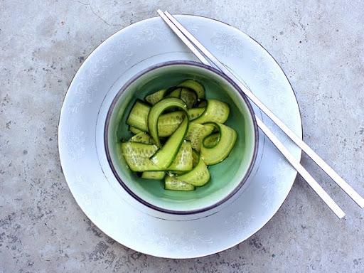 Peel the cucumber, and use a vegetable peeler or mandoline to slice it lengthwise into thin ribbons. Place the ribbons in a small bowl and drizzle geenrously with the ginger dressing (the complete recipe reserves some dressing for an accompanying herb salad).