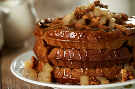 To prepare the waffles, place the flour, baking powder, baking soda, salt, and ground spices in a large bowl. Lightly whisk the ingredients until well-combined. Set aside.