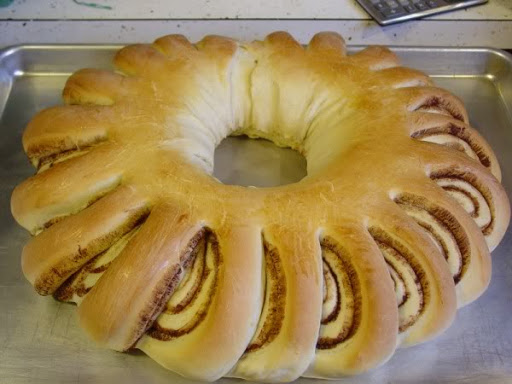 Place seam down on a greased baking sheet and pinch the ends together to form a ring. With kitchen scissors, cut from the outside edge to 2/3’s of the way towards the center of the ring at 1 inch intervals. Separate the strips slightly and twist to allow the filling to show. Cover and let rise again until doubled. (About 45 minutes to an hour)