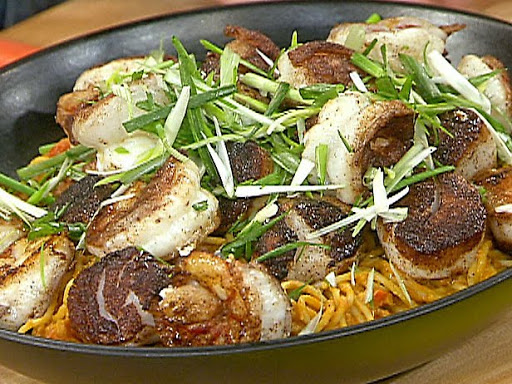 Pumpkin-Peanut Curry Noodles with Five-Spice Seared Scallops and Shrimp
