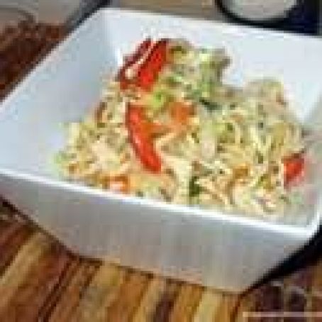 In a medium serving bowl, combine the slaw mix and the peppers. Just before serving, add the Orange Chili Vinaigrette, tossing gently to coat. Serve immediately.