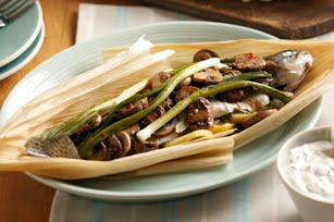 CORTA 3 pedazos grandes de papel aluminio fuerte y coloca 4 hojas de maíz en el centro de cada uno; ponles los pescados encima. Coloca 4 pedazos de limón y 1 cda. de cilantro en la cavidad de cada pescado. Ponles aproximadamente 1 taza de mezcla de vegetales y 4 cebollas; cúbrelos con 2 hojas de maíz. Levanta los lados del papel aluminio. Dóblalos dos veces por arriba y por los extremos para sellar los paquetes de modo que quede espacio para que circule el calor por dentro. Coloca los paquetes en un molde de 15x10x1 pulgs.