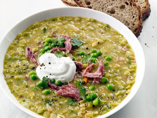 Strain into a large serving bowl, using a strainer with large holes, to force the pulp through the holes. Cook's Note: The ham can be chopped into small pieces and added to the soup before serving, if desired.