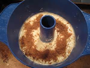 *Grease Bundt pan real thick with butter and sprinkle it with sugar and cinnamon for crust on outside.