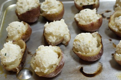 Cut each potato in half lengthwise. With a spoon or melon baller, scoop out inside of the potatoes, leaving a very thin rim of potato inside the skin. Add the potato pulp to the mixing bowl with the other ingredients. Using a potato masher or fork, gently mash the ingredients together until fluffy and smooth. Taste and adjust the seasoning – be sure to salt it adequately. Spoon the mixture back into the potato shells.