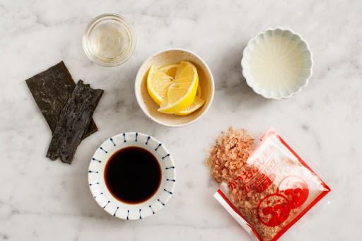 Lightly rinse the kombu and place in a small bowl along with the meyer lemon juice, shoyu, rice vinegar, and mirin. Cover and let sit for at least a few hours, but preferably overnight.