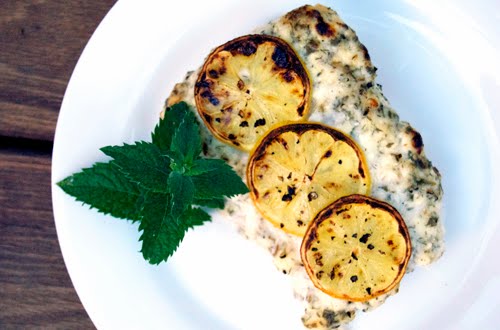 Preheat the oven broiler. Whisk together the mayonnaise, feta, dill, mint and lemon juice in a small bowl.