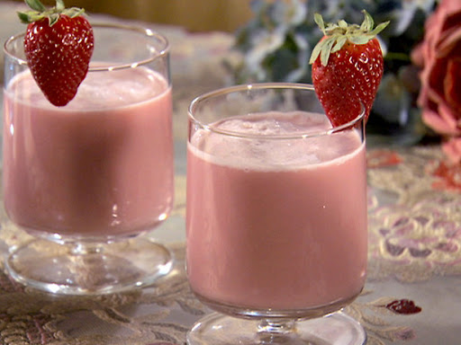 Shake vigorously and strain into rocks glass with ice. Slice half way up middle center of strawberry and slide onto glass edge to garnish.