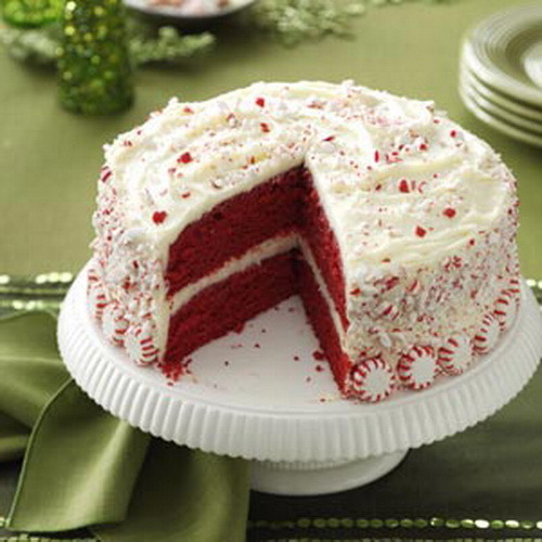 A couple of years ago, I saw a recipe for a peppermint red velvet cake that called for cake mixes. I prefer homemade cakes, so I developed this one from scratch. It is a beautiful, elegant dessert. In the summer, I omit the peppermint and use fresh berries, adding them between the layers and on top of the frosting. —Aimee Fortney, Fairview, Tennessee