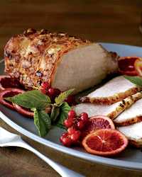 Preheat the oven to 450°. Roast the pork for 10 minutes. Lower the oven temperature to 400° and roast the pork for about 35 minutes longer, until an instant-read thermometer inserted in the thickest part registers 135°. Transfer the roast to a cutting board and let rest for 15 minutes before slicing. Discard the string and carve the pork into thin slices. Arrange on a platter, garnish with the orange slices, red currants and mint and serve.