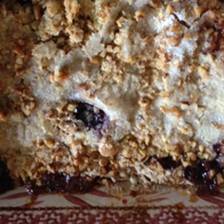 Toss together frozen blueberries and 3/4 cup sugar, and spoon over apple pie filling. Sprinkle cake mix evenly over fruit. and drizzle with melted butter. Sprinkle with chopped walnuts and remaining 1/4 c sugar.
