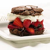 Rich chocolate shortcakes with sweetened strawberries, chocolate sauce and whipped cream. Shortcakes are fragile so be extra careful when splitting them for dessert.
