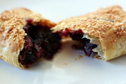 Working with 1 pastry rectangle at a time, place on a work surface and brush edges with egg wash. Scoop 3 tablespoons cherry mixture onto one side; fold dough over filling so that short ends meet, forming a 5×3″ packet. Crimp edges with a fork to seal. Using a sharp knife, cut a few slits in top of pie to vent. Place on prepared baking sheet; repeat with remaining dough and filling.
