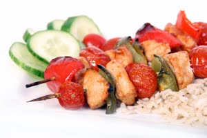 Drain chicken, discarding marinade. Thread chicken, vegetables, and cherry tomatoes on skewers as desired. Grill skewers, covered with grill lid, for 6 to 8 minutes, turning skewers occasionally or until vegetables are tender and chicken is cooked through. Serve with rice.