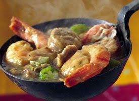3.- Incorporar la mezcla de harina en la mezcla de las mollejas. Agregar 4 tazas de agua caliente, 1 taza a la vez, revolviendo constantemente. Añada el quimbombó ( okra ), carne de cangrejo, camarones y los ostiones. Caliente hasta que hierva, reduzca el fuego a bajo. Hierva a fuego lento 5 a 10 minutos o hasta que los camarones estén rosados y firmes. Servir sobre arroz.