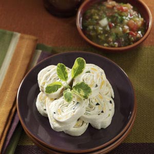 In a large bowl, beat the first eight ingredients until blended. Spread over the tortillas; roll up tightly. Wrap each with plastic wrap, twisting ends; refrigerate for several hours.