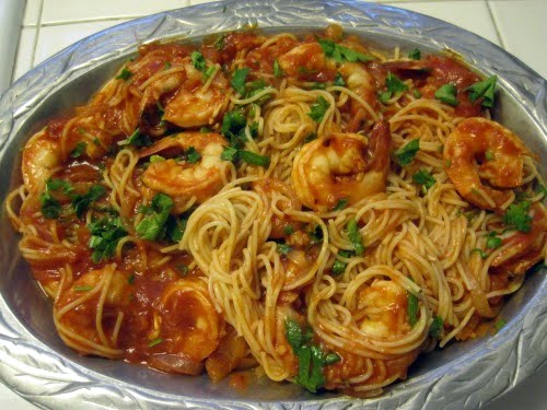 En una cacerola (usa una de tamaño grande), calienta el aceite y cocina la cebolla, el ajo y añade las pepper flakes. Una vez listo, añade la salsa y pasta de tomate y el vino. Deja que esta salsa reduzca un poco, checa que esté ok de sal y finalmente añade los camarones (no los cocines por más de 2-3 minutos)