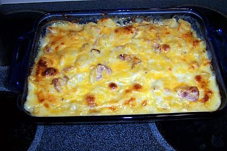 Layer potatoes, chopped ham and white sauce; then repeat for next layer (ending with white sauce on top) in a 1 1/2 quart baking dish.