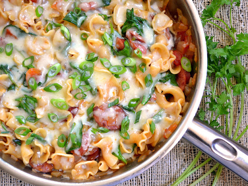 Stir in the fresh spinach, one cup at a time, until wilted. If you add it all at once, the skillet will be too full to stir. Keep the heat on while adding the spinach, so the liquid will continue to simmer and thicken.