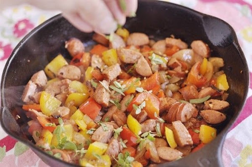 Brown onions and peppers in 1 Tbsp olive oil until soft.