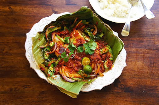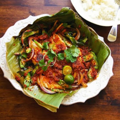 Place two banana leaves on a hot cast iron pan and grease with peanut oil. Place two tablespoons of sambal paste in the center of the banana leaf, and spread it around. Place two pieces of fish fillet over the sambal paste and let it cook briefly, about a minute. Then cover the pan with a lid. Once the fish is cook on one side, about 4 to 5 minutes. Remove the lid, use a spatula to turn the fish over. Scatter the prepared vegetables all over the fish and top it with extra sambal (about 2 Tbsp)