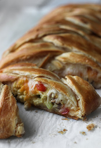 6. Carefully “braid” the strips over the top of the filling by alternating sides and crossing them over one another. It’s okay if there are some gaps, you just don’t want gaping holes. You can always pinch the dough together. Once the “braid” is complete, seal the ends by pinching the excess dough together. I have found that I often have an extra braid strip or two at the bottom that I can rip off and use to seal the ends.