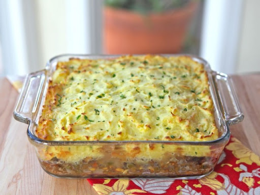 Place the dish in the oven and let it bake for about 30 minutes till the tips of the potatoes turn golden brown. Increase heat at the end of cooking for more browning, if desired. Sprinkle the remaining 1 tbsp of chopped parsley on top of the pie to garnish. Serve hot.