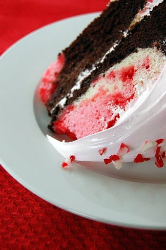Set out both prepared cake pans. In the first pan scoop 2 cups of chocolate batter into the pan, spread out with spatula. Next scoop 1 ½ cups white batter with peppermint chips into the center of the chocolate batter. Spread out to form a circle. Lastly scoop 1 cup of the remaining pink into the center of the pink batter.