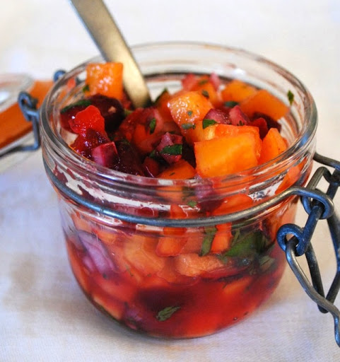 Cranberry Persimmon Salsa, Rancho La Puerta Style . A tasty seasonal topping for any dish. On Rancho La Puerta’s organic farm, they cultivate the squat persimmons known as fuyu, which are ready in the fall. Fuyus are non-astringent (more free of tannins) and get sweeter after picking, but don’t confuse ripening with rotting; chop while still somewhat firm. The larger heart-shaped persimmons are NOT suitable for this recipe. Mango can be used instead of persimmon.