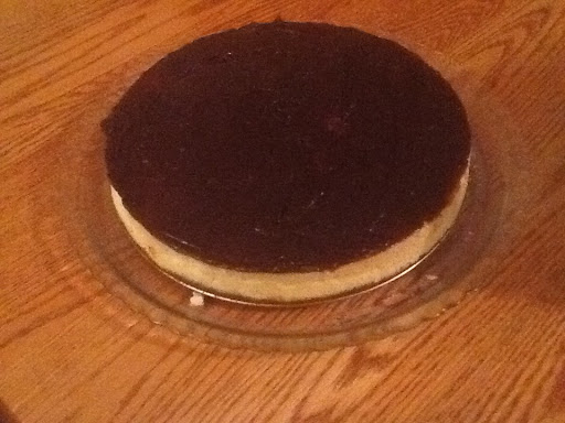 5. Topping: Place 3/4 cup (175 mL) chocolate flavoured sauce in a small heavy bottomed saucepan. Bring to a boil, stirring frequently. Turn heat to medium low and continue cooking, stirring constantly for 2-3 minutes. Spread over cheesecake. Refrigerate until ready to use. Drizzle remaining chocolate flavoured sauce over slices before serving.