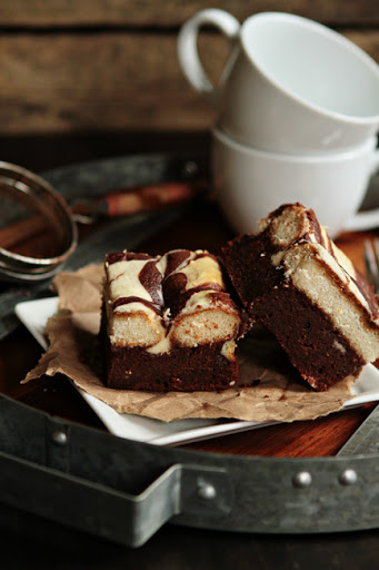 2. In another bowl, combine the mascarpone cheese, cream cheese, and 1/4 cup of sugar, 4 egg whites and vanilla extract. Spread topping over ladyfingers over ladyfingers. Place spoonful of brownie batter on top of the creamy filling and swirl it lightly with a toothpick or knife.