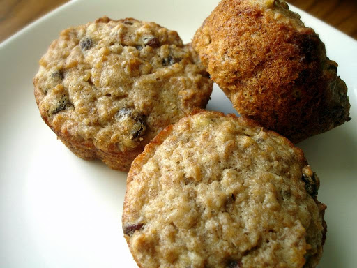 4. Add flour mixtur and stir in raisins; stirring only until combined. Portion batter evenly into twelve 2 1/2-inch muffin-pan cups coated with cooking spray.