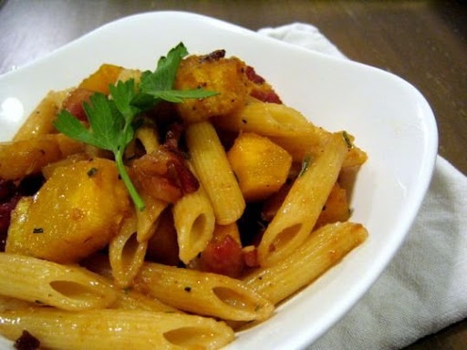 Add the chunks of squash and pancetta to the pan. Drain the pasta, reserving about 1/2 cup of the cooking water, and add the pasta to the squash/pancetta mixture. Toss everything to coat, then stir in the Parmesan. Add a bit of the pasta water if the mixture seems too dry.