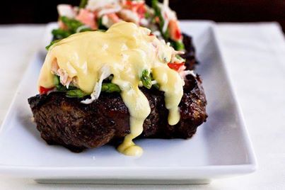 Plate the steaks and top with a generous portion of the crab-asparagus mixture. Top with additional Bearnaise sauce and serve.
