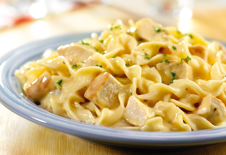 Heat the soup, milk, black pepper, cheese, chicken and noodles in a 4-quart saucepan over medium heat until the mixture is hot and bubbling, stirring occasionally. Sprinkle with the parsley before serving