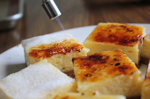 6. On a heat-safe work surface, sprinkle the tops of each square with sugar, and being careful, torch the tops with a kitchen torch until it turns a deep amber color. If you want a thicker brûlée top, sprinkle more sugar on top. You can refrigerate the cheesecakes, but the brûlée will start to soften as it sits in the fridge. Enjoy!