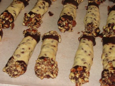 Dp ends of cookies into melted chocolate. Roll ends in walnuts. Place on wax paper until set. Freeze up to 1 month, if desired.